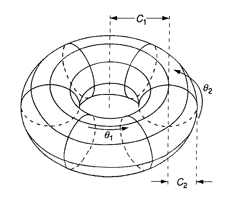Trajektorie uvedeného systému lze znázornit křivkami ležícími na povrchu toru (viz obr.3.13), který vznikne složením dvou nezávislých kruhových pohybů podle řešení (3.43). Pokud nejsou koeficienty b1, b2 racionálně závislé, trajektorie na povrchu toru nebude uzavřená, avšak bude procházet v libovolně blízkém okolí každého bodu (vyplní "hustě" celý torus). Takový vývoj systému se nazývá kvaziperiodický (stav systému se vrací do libovolné blízkosti každého bodu ve fázovém prostoru po dostatečně dlouhém časovém intervalu). Fázový portrét periodického a kvaziperiodického chování není zřejmě kvalitativně ekvivalentní, tj. dostáváme nový druh chování systému, který u rovinných dynamických systémů neexistuje. To je dáno tím, že trajektorie ve fázovém prostoru se nemohou protínat, avšak pokud leží trajektorie na varietě (byť dvojrozměrné) mohou se míjet po jiném povrchu variety. Při projekci se pak trajektorie zdánlivě protínají.