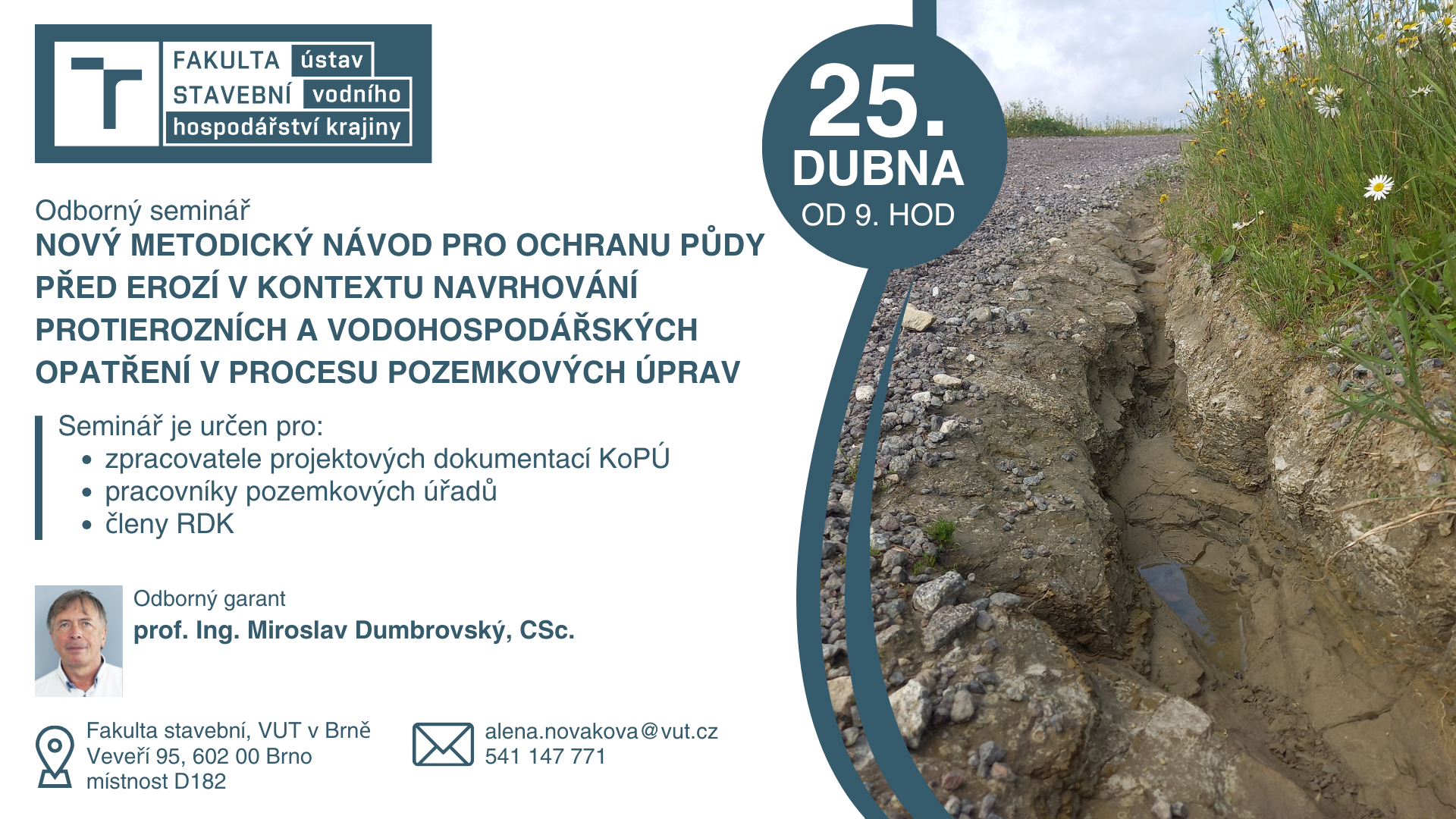 Dne 25.4. 2024 pořádá Ústav vodního hospodářství krajiny seminář "Nový metodický návod pro ochranu půdy před erozí v kontextu navrhování protierozních a vodohospodářských opatření v procesu pozemkových úprav".