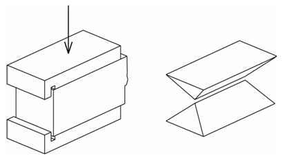 Obr. 1 Zkouška tlakem na zlomku trámce (vlevo) a zbylé soudržné klínovité útvary (vpravo)
